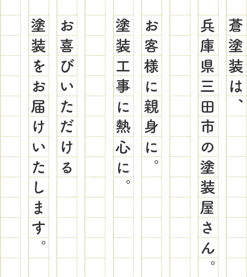 蒼塗装は三田市に寄り添い、地域のお住まいの塗り替え工事を行っております。お客様にお喜びいただけるよう、細かな箇所から丁寧に塗り替え工事を行っておりますので、お近くにお住まいの方は、ぜひ当方までご相談ください。